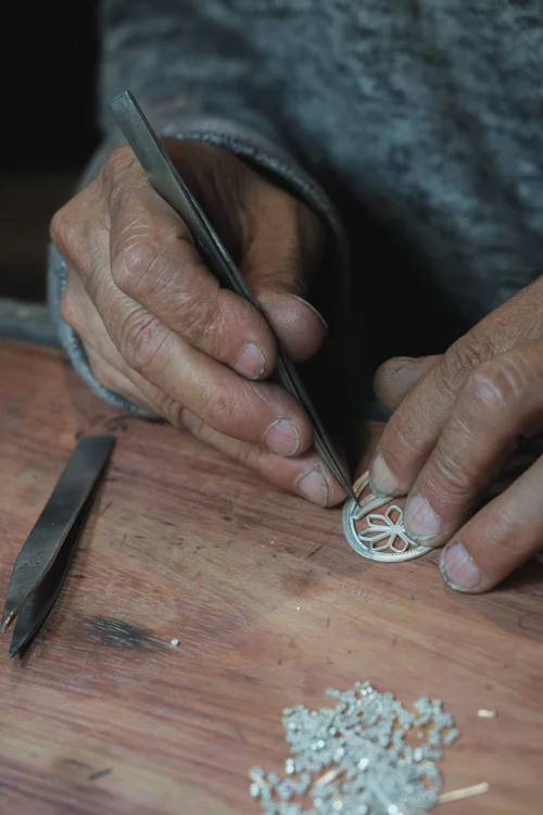 Flavio Alejandro Jaramillo Villavicencio is a third-generation jeweller originating from a long family tradition of filigrana makers. His family is well known for having developed and spread the technique around the area, continuing their practice to the present day. Flavio trained with his father Guilberto Jara and his uncle Juan Octavio. Together with his wife, son and grandson they run Puerta del Sol a workshop and a jewellery shop which continues to train young aspiring jewellers.