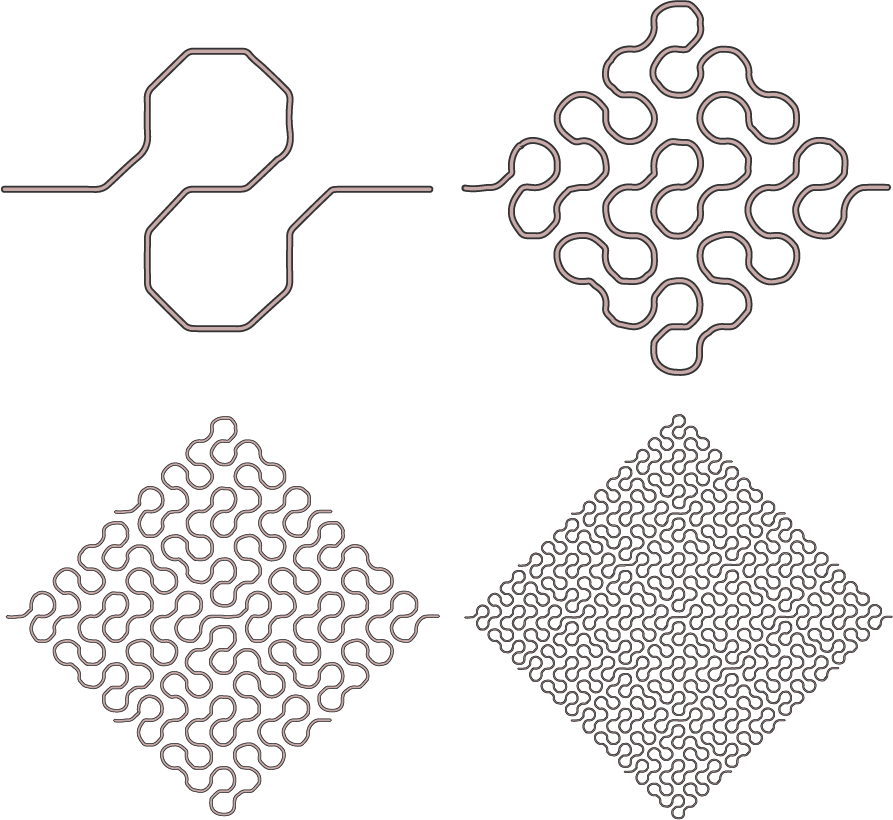 Space-filling curves are special cases of fractal curves or fractals which are simply never ending patterns. Fractals are complex, self- similar (not the same), repeated patterns at different scales.