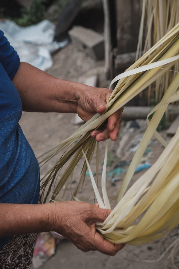 After selecting and separating the stems the palm is boiled for about a minute, transforming it into a smooth material. The split stems are then bashed and laid out to dry for days avoiding direct exposure to sunlight. The final stage of preparation is a twelve-hour slow cooking process using sulphur to whiten the fibers and ensure their durability.