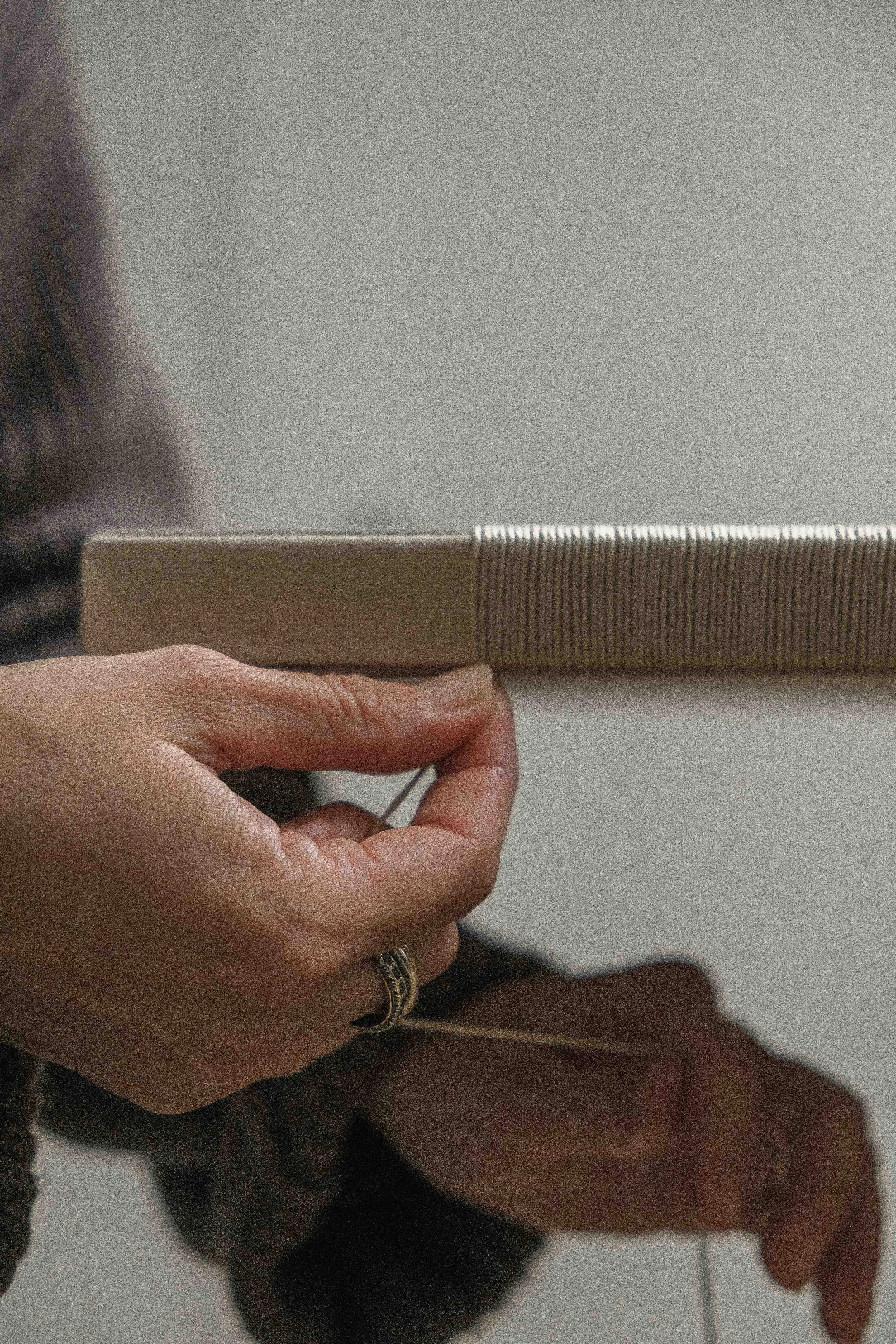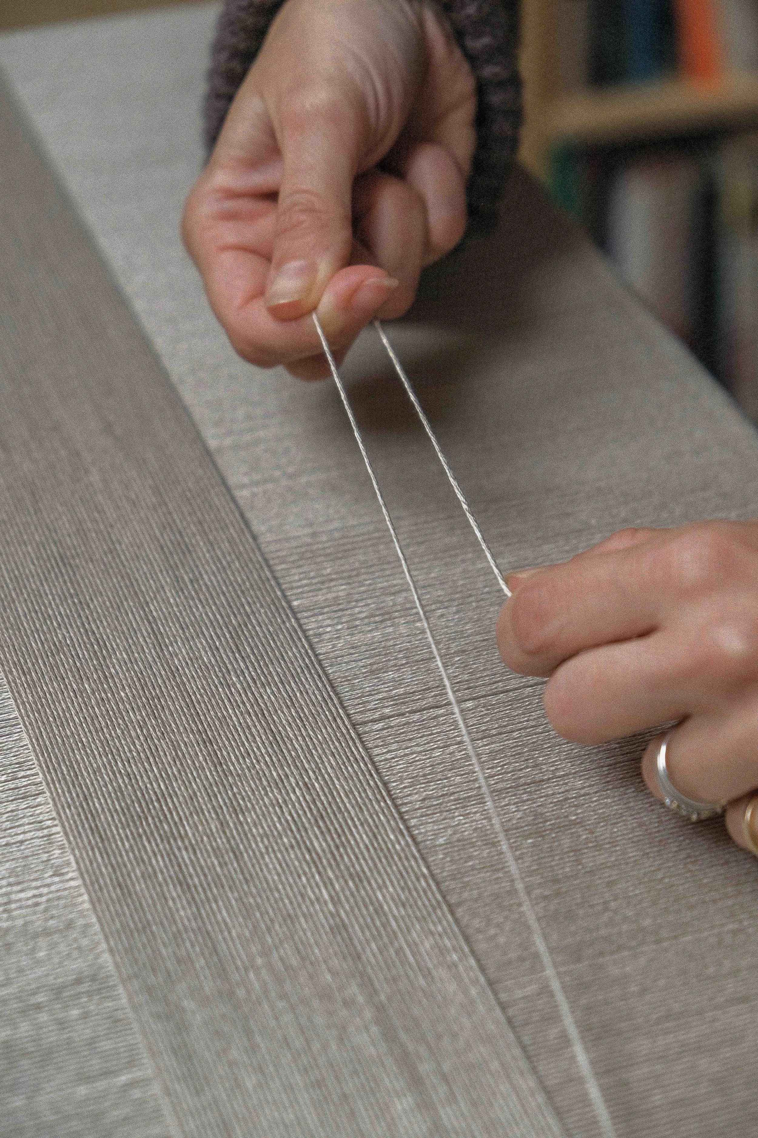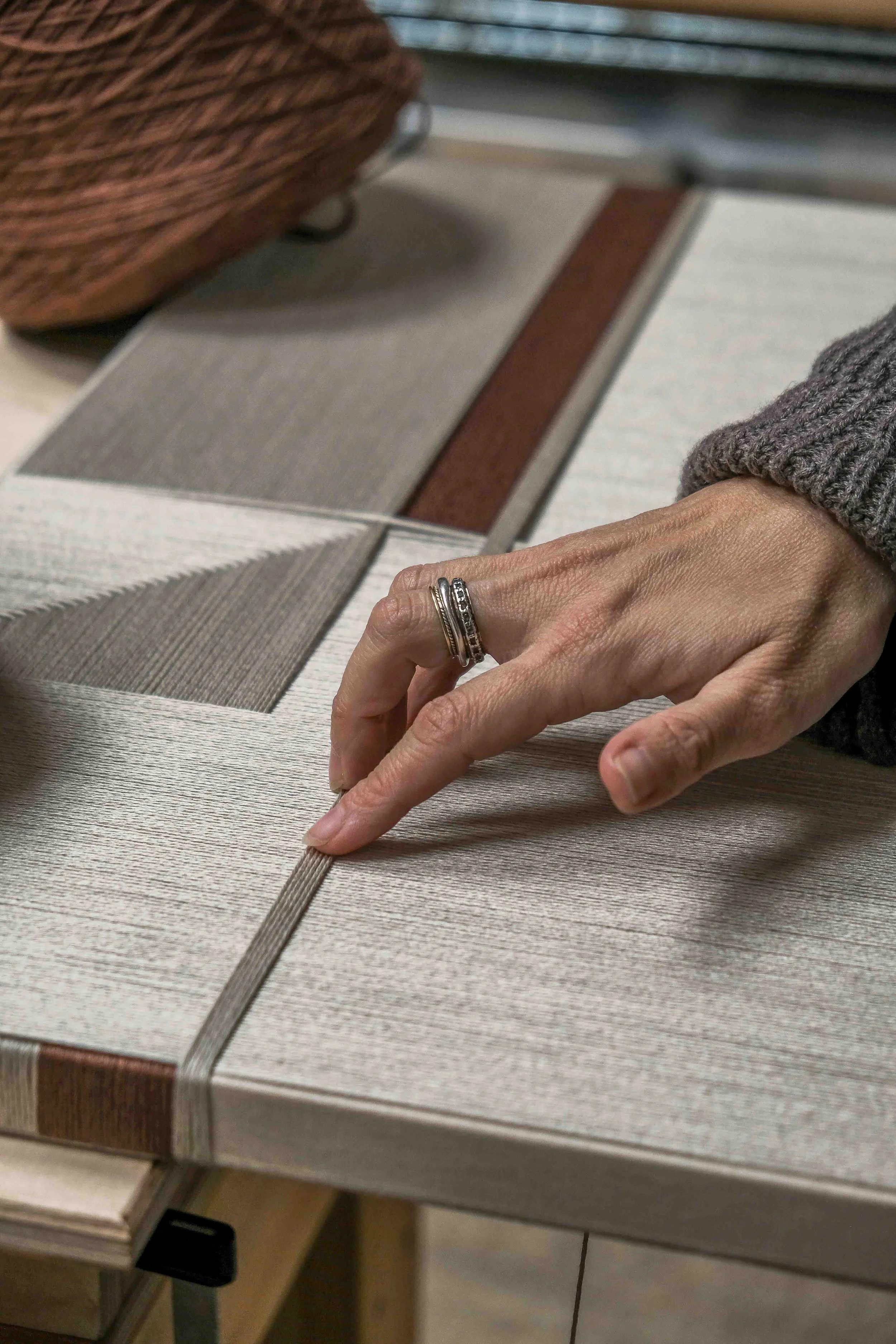 Final woven interlace designs made in oak solid wood and woven in mercerised cotton fibers, using a custom palette.